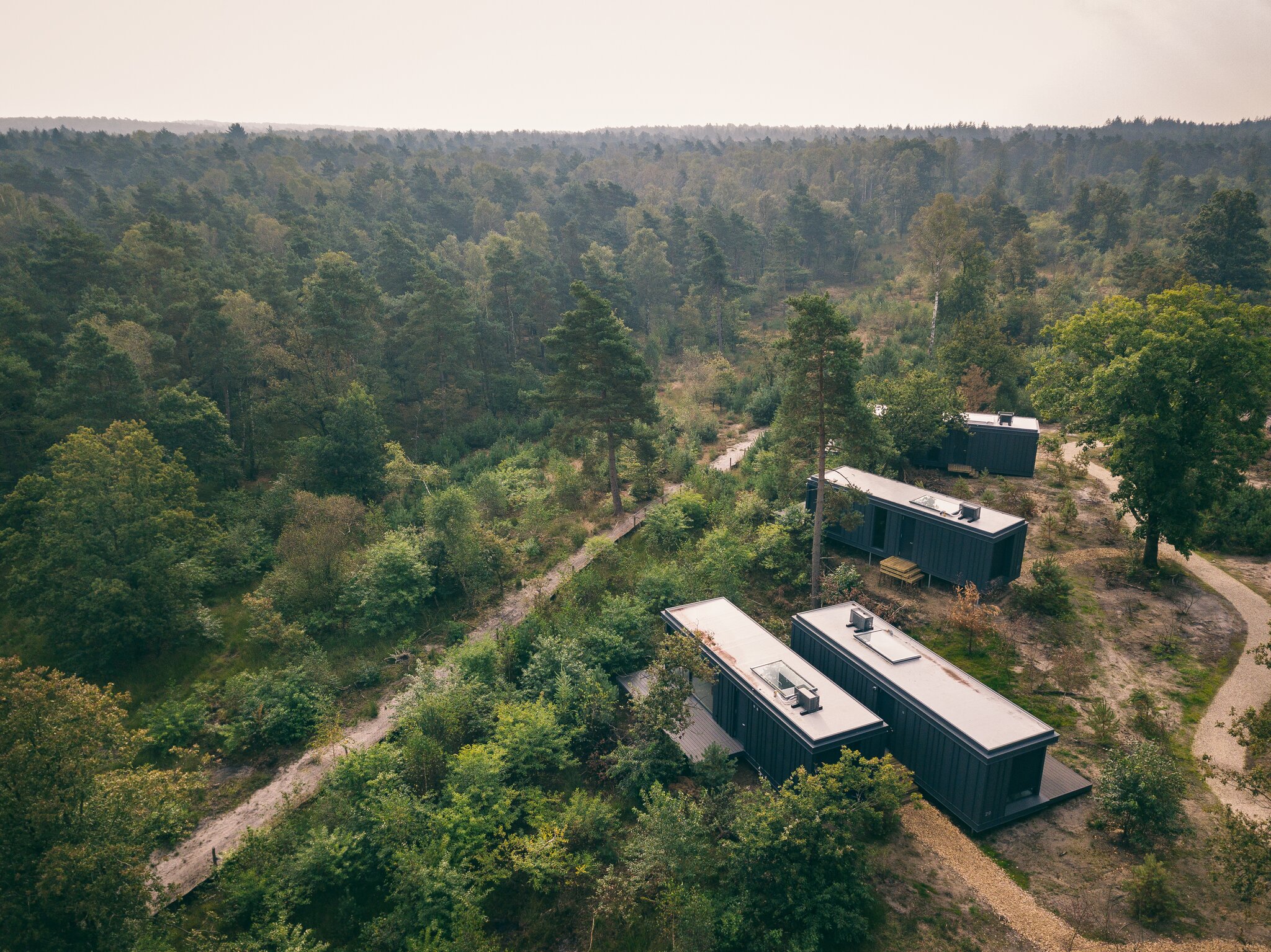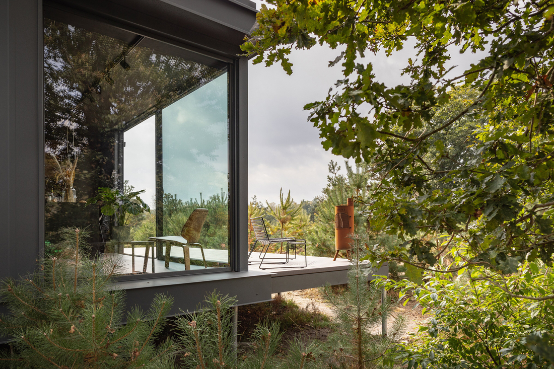 Cuber Veluwe is an intimate outdoor retreat where nature and design come together. Couples stay in private cabins with panoramic forest views, outdoor saunas or hot tubs, and even showers beneath the stars.